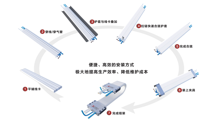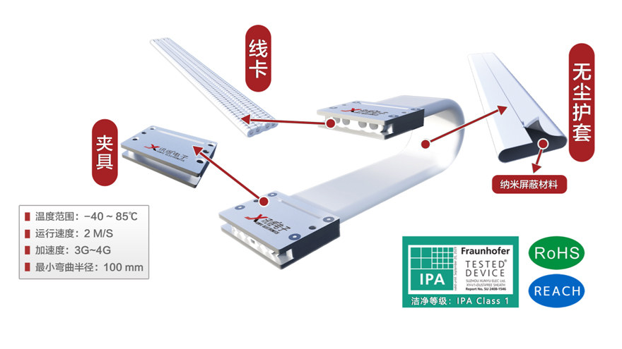 訊煜開放易安裝式無塵拖鏈(第3代屏蔽款無塵拖鏈)是一種滿足無塵環(huán)境下線纜防護及運動需求的產(chǎn)品,拖鏈自帶屏蔽抗干擾功能(內(nèi)層采用納米屏蔽材料,吸收拖鏈內(nèi)部線纜EMI竄擾)。易安裝式優(yōu)于封閉式拖鏈結(jié)構(gòu),外層護套采用拉鏈開口式結(jié)構(gòu),便于線纜的安裝和更換。中間線纜由柔性線卡分隔和固定,提高線纜排布的速度和美觀度,同時減少線纜絕緣層的磨損,延長線纜的使用壽命。支持多層疊加,支持龍骨支撐,滿足長行程應(yīng)用場景。