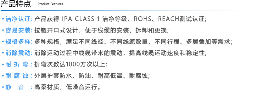 訊煜開(kāi)放易安裝式無(wú)塵拖鏈?zhǔn)且环N滿足無(wú)塵環(huán)境下線纜防護(hù)及運(yùn)動(dòng)需求的產(chǎn)品,拖鏈自帶屏蔽抗干擾功能(內(nèi)層采用納米屏蔽材料,吸收拖鏈內(nèi)部線纜EMI竄擾)。