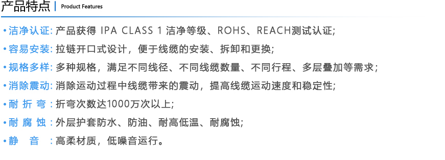 易安裝式優(yōu)于封閉式拖鏈結(jié)構(gòu),外層護套采用拉鏈開口式結(jié)構(gòu),便于線纜的安裝和更換。中間線纜由柔性線卡分隔和固定,提高線纜排布的速度和美觀度,同時減少線纜絕緣層的磨損,延長線纜的使用壽命。支持多層疊加,支持龍骨支撐,滿足長行程應(yīng)用場景。